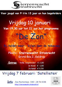 Op vrijdag 10 januari is de vijfde publieksavond van dit seizoen voor junioren in de leeftijdsgroep van 9 t/m 13 jaar én hun begeleiders. Het thema van deze avond is: “De Zon”. Op Aarde bestaat leven, omdat de Zon energie afgeeft aan de Aarde. Waar komt deze energie in de Zon vandaan? Hoe zit de Zon van binnen in elkaar? Wat zien wij aan de buitenkant van de Zon? Wat zijn zonnevlekken en hoe bewegen zij over de Zon? Wat zijn zonnevlammen? Zendt de Zon alleen licht uit of zijn er ook andere soorten straling? Wat is zonnewind en wat merken wij daarvan? We beginnen stipt om 19.30 uur en eindigen om ca. 21.00 uur.