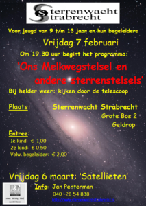 Op vrijdag 7 februari is de zesde publieksavond van dit seizoen voor junioren in de leeftijdsgroep van 9 t/m 13 jaar én hun begeleiders. Het thema van deze avond is: “Het melkwegstelsel en andere sterrenstelsels”. Op donkere plaatsen is ‘s nachts bij heldere hemel de “Melkweg” te zien. Wat is dit? Hoe zit het melkwegstelsel in elkaar? Waar zit de Zon in het melkwegstelsel? Wat zit er in het midden van het melkwegstelsel? Kan er leven bestaan in het centrum van het melkwegstelsel? Of aan de rand? Hoe zien andere sterrenstelsels er uit? We beginnen stipt om 19.30 uur en eindigen om ca. 21.00 uur.