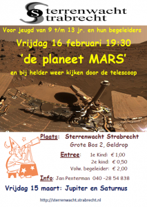 Op vrijdag 16 februari is er weer een publieksavond voor junioren in de leeftijdsgroep van 9 t/m 13 jaar én hun begeleiders. Het thema van deze avond is: “Mars”. De planeet Mars bevindt zich verder van de Zon dan de Aarde, maar heeft net als de Aarde een vast oppervlak. Wat zijn de verschillen met de Aarde? Hoe beweegt Mars om de Zon en hoe draait hij om zijn eigen as? Waar en wanneer kunnen we Mars aan de hemel zien? Is er een atmosfeer en wat is het verschil met die van de Aarde? Is er water op Mars of is er vroeger water geweest en is er leven? Wat hebben ruimtevaartuigen naar Mars gezien? Kunnen mensen in de toekomst leven op Mars?