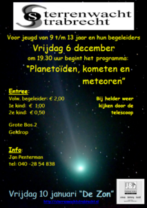 Op vrijdag 6 december is de vierde publieksavond van dit seizoen voor junioren in de leeftijdsgroep van 9 t/m 13 jaar én hun begeleiders. Het thema van deze avond is: “Planetoïden, kometen en meteoren”. In de ruimte binnen ons zonnestelsel bewegen brokken rots en/of ijs in een baan om de Zon. De grootste zijn dwergplaneten en de kleinste brokjes zien wij alleen als ze verbranden, terwijl ze hoog door onze atmosfeer vliegen. Waarom hebben zij verschillende namen? Waar in het zonnestelsel vliegen zij rond? Waar komen zij vandaan? Kunnen zij gevaarlijk zijn voor de mens? Wat is het verschil tussen meteoren en meteorieten? Sommige van deze brokken hebben bezoek van een ruimtesonde gehad. Welke en waarom?