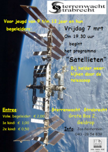 Op vrijdag 7 maart  is de zevende publieksavond van dit seizoen voor junioren in de leeftijdsgroep van 9 t/m 13 jaar én hun begeleiders. Het thema van deze avond is: “Satellieten”. Om de Aarde draaien duizenden satellieten. Ook om andere planeten, de zon en de maan draaien satellieten. Er zijn satellieten die in ongeveer 90 minuten rond de Aarde draaien, maar ook satellieten die er een dag over doen en boven een vast punt op het aardoppervlak blijven hangen. Hoe kan het dat zij niet neerstorten? Hoe kan een satelliet boven een vast punt blijven hangen? Waar zijn al die satellieten voor nodig? Waarom zijn er satellieten die rond andere hemellichamen draaien? We beginnen stipt om 19.30 uur en eindigen om ca. 21.00 uur.