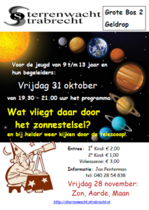 Op vrijdag 31 oktober is de tweede publieksavond voor junioren in de leeftijdsgroep van 9 t/m 13 jaar én hun begeleiders. Het thema van deze avond is “Wat vliegt er door het zonnestelsel?”. In het zonnestelsel vinden we planeten (rotsachtige planeten, gasreuzen, ijsreuzen), dwergplaneten, manen, planetoïden, ijsdwergen, kometen, meteoren. Wat zijn dit, waar zijn ze te vinden, hoe bewegen ze om de Zon (want dat doen ze allemaal behalve de manen)? Hoe bewegen de manen?